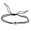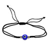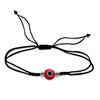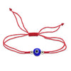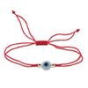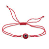 Pulseras en hilo rojo o negro de 0.5 mm (adorno) y 0.65 mm (tejido), con ojo de cristal de 6 mm en azul, blanco o rojo, y detalles en goldfilled de 2.5 mm. Ajustables de 15 a 18 cm. Hechas a mano con estilo y protección.